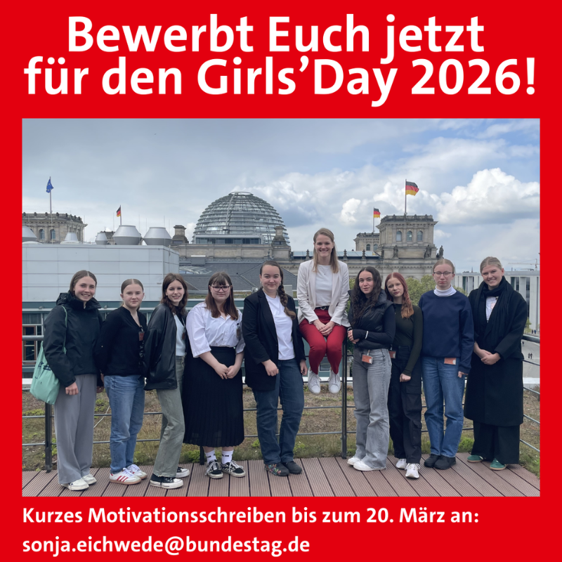 Ein Blick hinter die Kulissen der Politik! Ihr seid zwischen 14 und 18 Jahren alt, kommt aus unserer Region und interessiert euch für Politik? Dann nutzt die Chance und bewerbt euch für den Girls‘ Day im Bundestag! Erlebt den politischen Alltag hautnah: Führung durch den Bundestag, Austausch mit Sonja Eichwede, Gespräch mit den Mitarbeiterinnen.